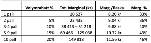 Förtjänsten vid olika pallvolymer blir enligt tabellen, när ni säljer för 25kr/flaska eller 300kr/kolli, och volymrabatter tillämpas. Panten är exkluderad.